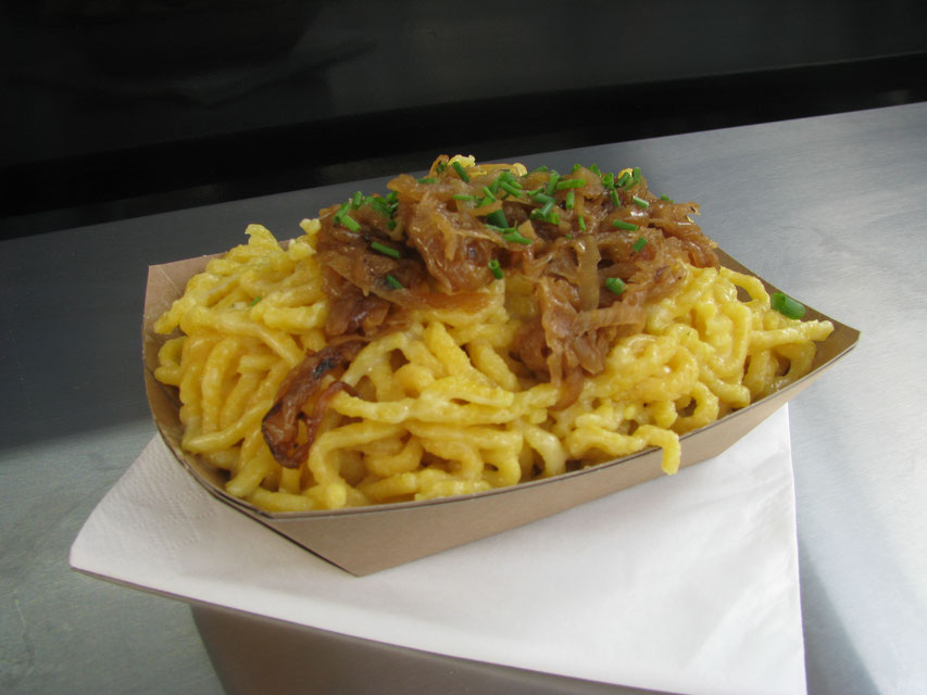 Kurz nachdem Sie bestellt haben, verwandeln wir unsere frischen Spätzle vor Ort in unsere leckeren Kässpätzle.